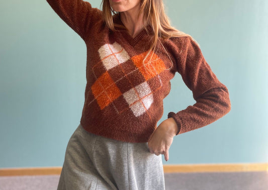 vtg 60s CROPPED ARGYLE SWEATER // vintage brown orange autumn colors contrast geometric print kurt cobain mohair style v neck cute crop top