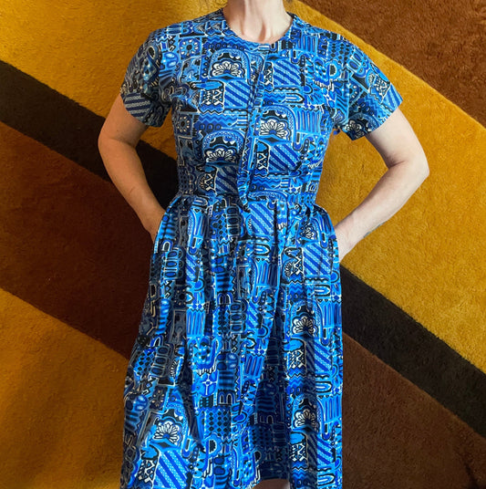 vtg 60s 2 PIECE JERSEY DRESS // abstract pattern set with pockets school outfit bright blue tiki party mod retro autumn layers teacher style