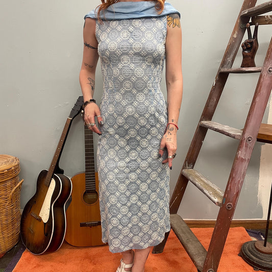vtg 60s BOW TIE SHAWL // vintage chiffon bow net lace embroidered full length fancy evening gown floral ethereal blue flowy photo shoot gown