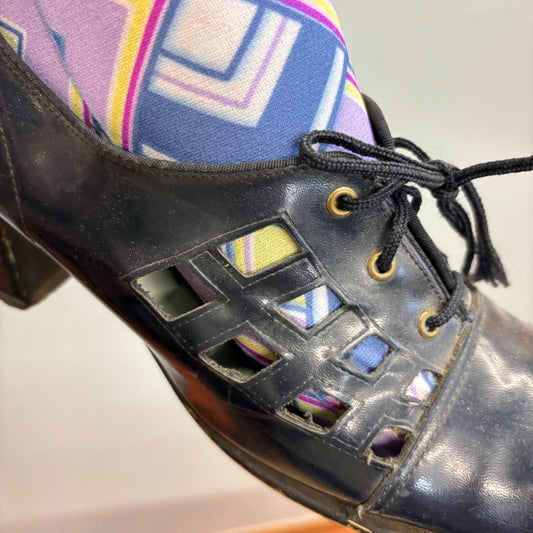 vtg 60s CUT OUT PUMPS // vintage mod black leather & suede chunky platform heels lace up retro stacked loafers soft goth wednesday addams