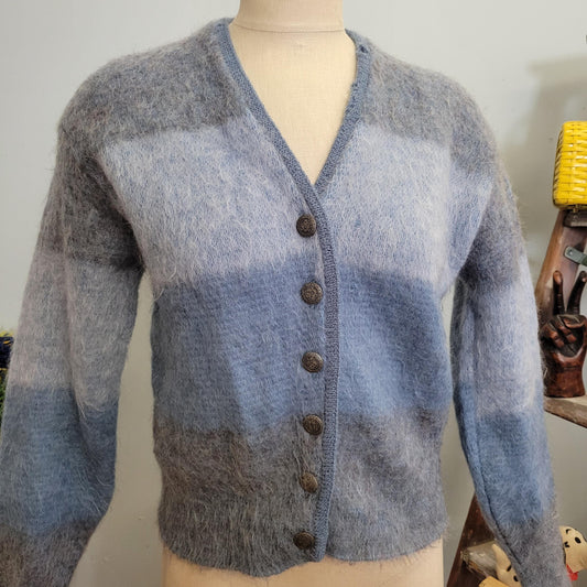vtg 60s BLUE MOHAIR CARDIGAN // vintage lady campus women’s large patchwork striped ombré multicolor pastel shaggy cobain grunge rockabilly