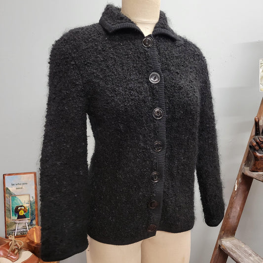 vtg 60s BLACK SHAGGY CARDIGAN // vintage peck & peck fifth avenue new york medium collared mohair minimalist fitted cropped curly knit top