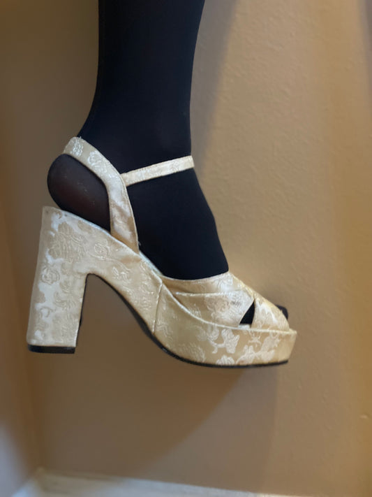 vtg 90s WHITE FLORAL HEELS // vintage off white floral brocade chunky thick strappy platforms valentines day first date sexy platform heels