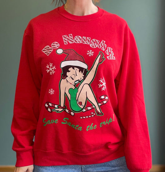 vtg BETTY BOOP XMAS Sweatshirt // vintage Y2K red naughty "Save Santa The Trip" risque pin up party sweater sexy winter festive holiday top