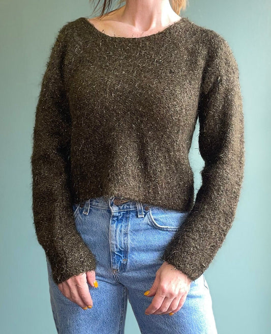 vtg 90s Y2K MOHAIR SWEATER // moss green fuzzy scoop neck fitted jumper metallic knit cropped 80s Sweater earth tone cute neutral minimalist