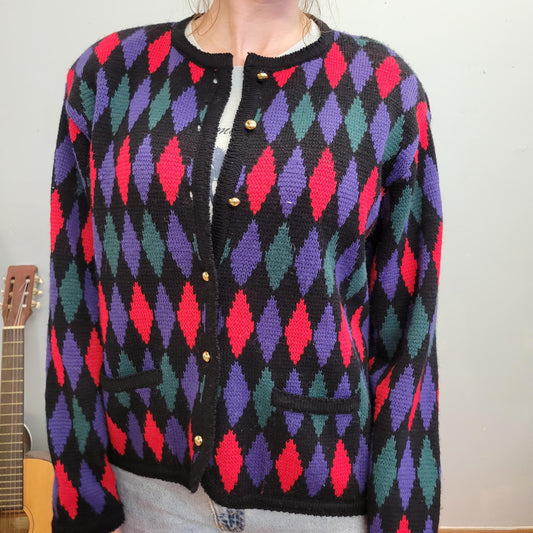 vtg ARGYLE PRINT CARDIGAN // bright neon multicolored diamond abstract patterned knit button up fitted cropped cute teacher sweater vintage