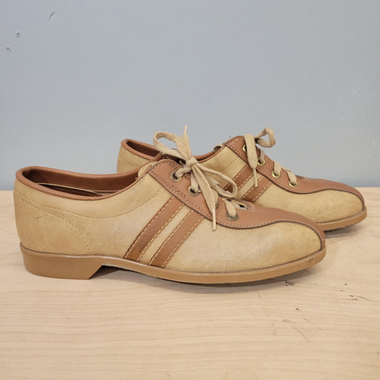 vtg BROWN BOWLING SHOES // vintage two tone mod lace up sporting oxford shoes minimalist earth tones neutral beige striped retro sneakers