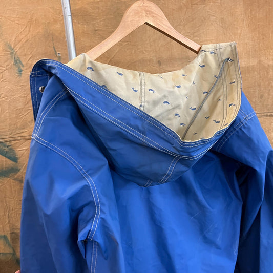 vtg WHALE PATTERN JACKET// vintage blue hooded whale lining autumn stranger things 90s grunge pvc shiny lightweight waterproof rainy parka