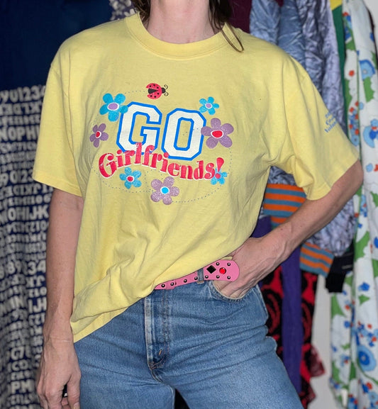 vtg Y2K GIRLFRIENDS SHIRT // 90s flower power shirt puff paint iron on pastel yellow tee nickelodeon hannah montana spice girls power puff