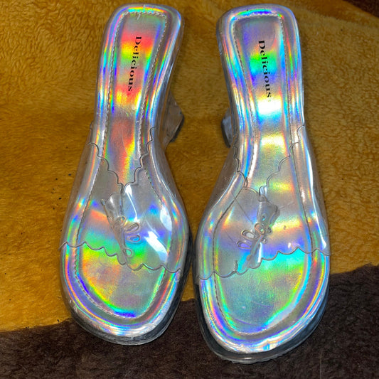 vtg Y2K CLEAR PLATFORM Heels // vintage size 9 womens silver holographic transparent chunky shoes delicious brand club kid 90s raver style