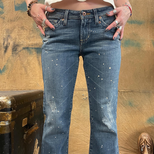 vtg y2k GOLD SPLATTER JEANS // vintage low rise straight leg boot cut mean girls bling worn stone wash denim hip huggers bell bottoms brat
