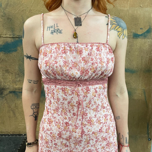 vtg Y2K FLORAL TANK DRESS // vintage 90s baby doll pin flowers dainty mini dress fairy core pastel romantic empire waist clueless sexy sheer