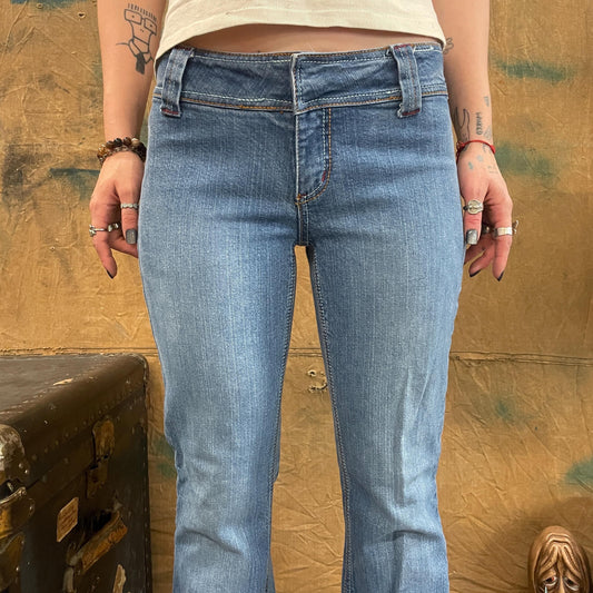 vtg Y2K JOUJOU JEANS // vintage light wash bareback distressed cut worn kick flare 90s retro style fashion casual straight leg mid rise