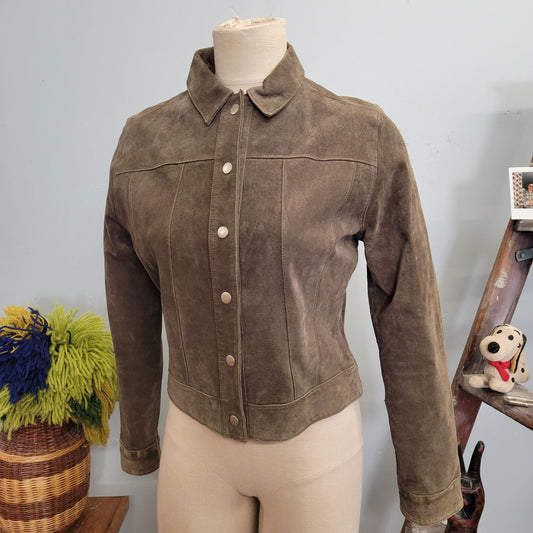 vtg Y2K CROPPED SUEDE JACKET // vintage arden b womens large neutral colors minimalist style autumn tones snap buttons collared mini jacket