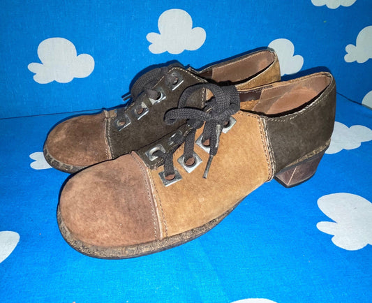 vtg 60s MOD PATCHWORK SHOES // vintage platform brown suede oxfords round toe chunky stacked leather retro earth tones twiggy style