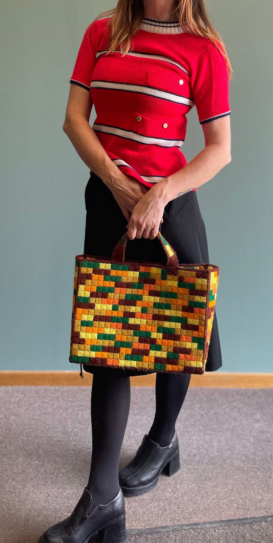 vtg 60s MOD YARN PURSE // vintage festive fall colors hand woven tote knitting rainbow halloween vibes multi color knit autumn grocery bag