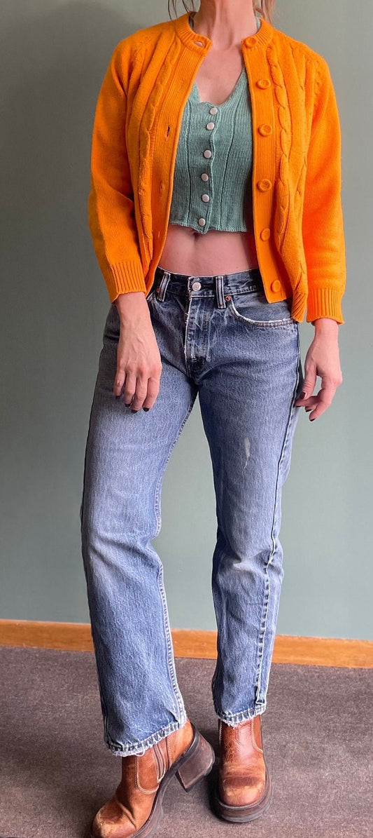 vtg 60s ORANGE CABLE KNIT Cardigan // vintage bright neon orange fuzzy sweater rockabilly kurt cobain autumn back to school teacher preppy