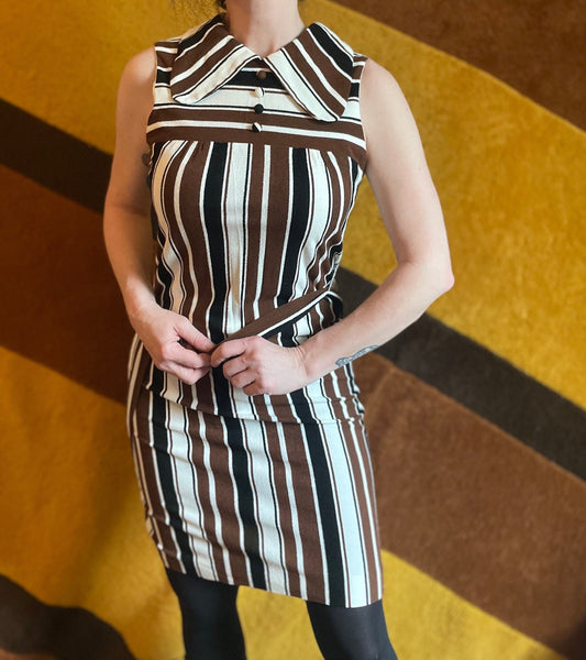 vtg 60s MOD STRIPES DRESS / pointy collar belted shift dress faux terrycloth tri tone black brown white mini dress beagle dog ear collar 70s