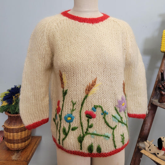 vtg 60s MOHAIR FLOWER SWEATER // vintage handmade rosanna women’s small cropped chunky knit shaggy fuzzy mcm 50s style autum preppy casual