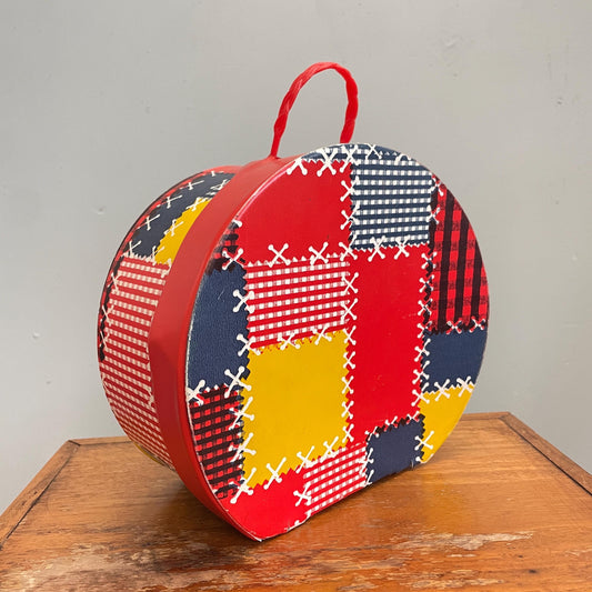 vtg 60s VINYL PATCHWORK HANDBAG // vintage primary colors hard case top handle wig case mod retro geometric pattern circle purse train case