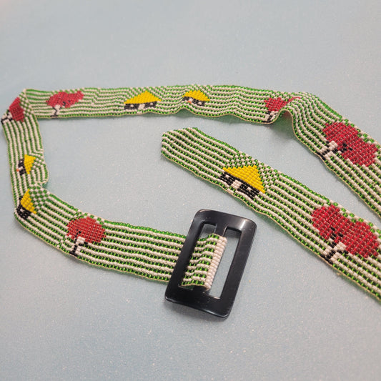 vtg 60s SKINNY BEADED BELT // vintage cute embroidered apple house trees youth accessory 70s hippie mod teacher cottage core