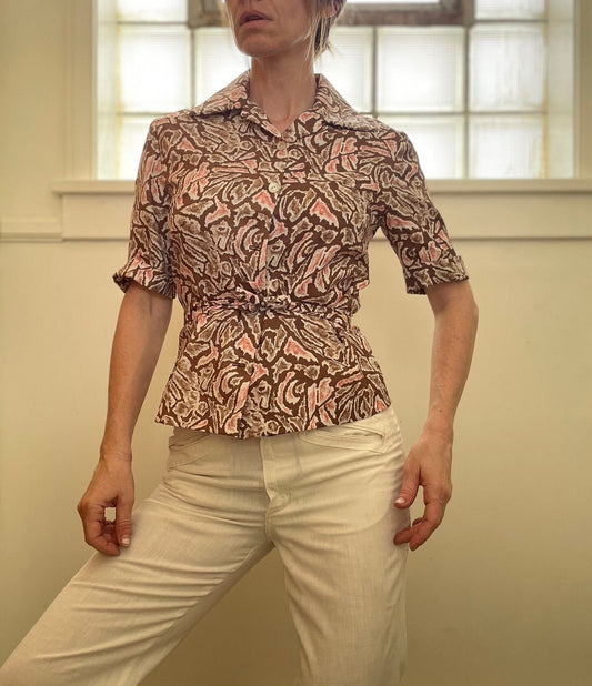 vtg 70s ABSTRACT PATTERN BLOUSE // vintage trippy psychedelic belted pointy collar silky slinky peplum fitted retro earth tones shirt