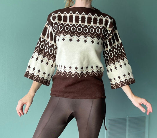 vtg 70s ABSTRACT PATTERN SWEATER // vintage pure gould usa sidney gould womens small flare sleeve tie waist cropped peplum autumn sweater