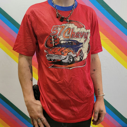 vtg 70s 57 MESH CHEVY JERSEY // vintage kids teen mesh sport shirt tee cars trucks hotrod classic 1957 oldies chevrolet football style