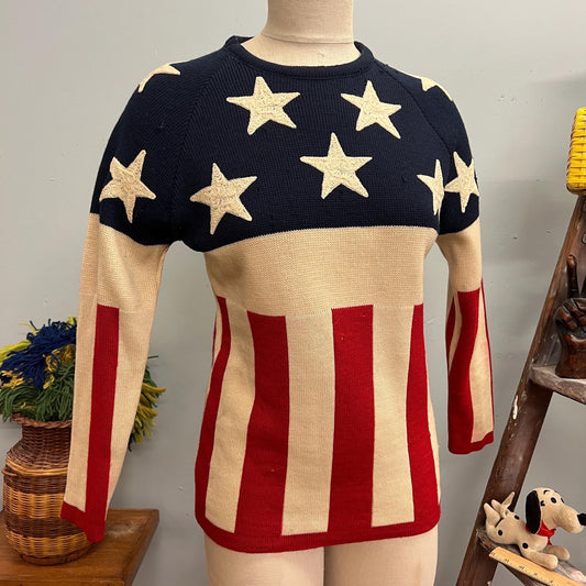 vtg 70s AMERICAN FLAG SWEATER // vintage lido of California small retro vote americana folk pop art bicentennial american woman stars stripe