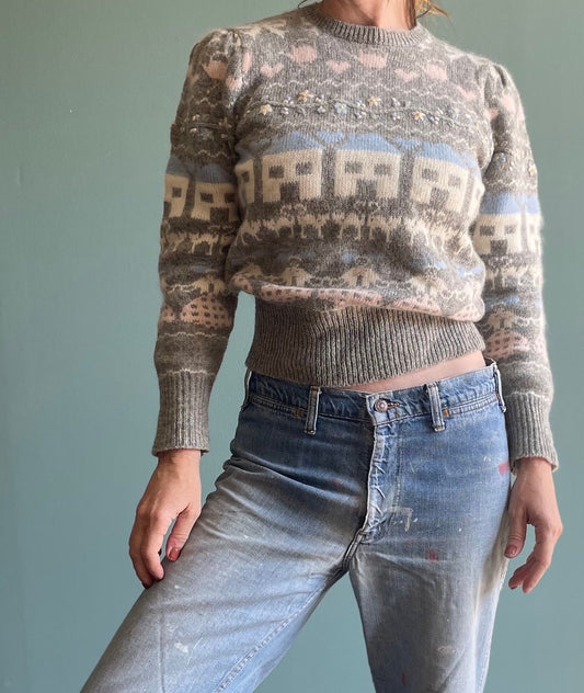 Vintage 80s HOUSE PATTERNED SWEATER // vintage angora fuzzy all over print hand knit Susan Bristol cottage pastel fairy teacher school fall