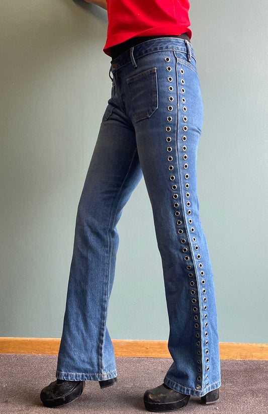 Vintage 90s Silver Ring Studded Flares / Low Rise Front Pocket Denim Jeans / 90s Y2k Bootcut Flares Fergie flare 2000s era