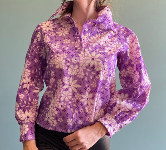 Vintage 70s LAVENDER FLORAL TOP // vintage jc penney medium autumn jewel tones retro pointy collar blouse semi sheer psychedelic fall top