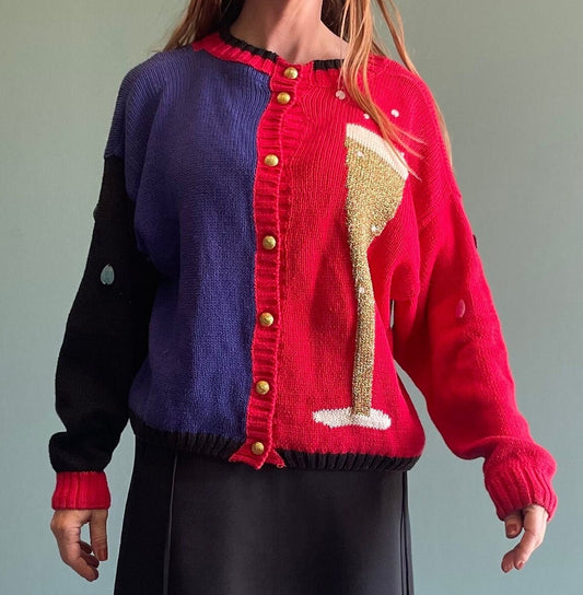 Vintage 90s Gantos Sweater / Champagne Glass New Years Eve Sweater / Funky Glitter Cardigan / Party Sweater
