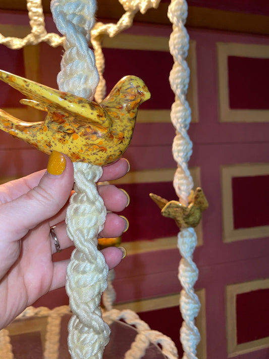 vintage 60s Glorious Macrame Hanging Table LAMP! / Ceramic Bird Plant hanger Holder / Boho Hippie Decor homemade retro knit knot hang