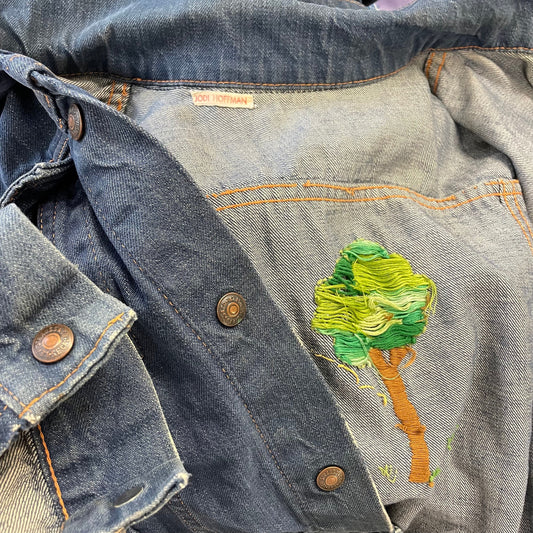 vintage faded 1960s LEVIS snap JEAN JACKET small distressed embroidered button up cropped 70s soft denim top trees and earth hippie style