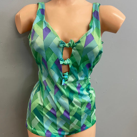 Vintage 70s psychedelic geometric print cut out swimsuit mod retro low cut boy short one piece bathing suit bright green blue bow ties