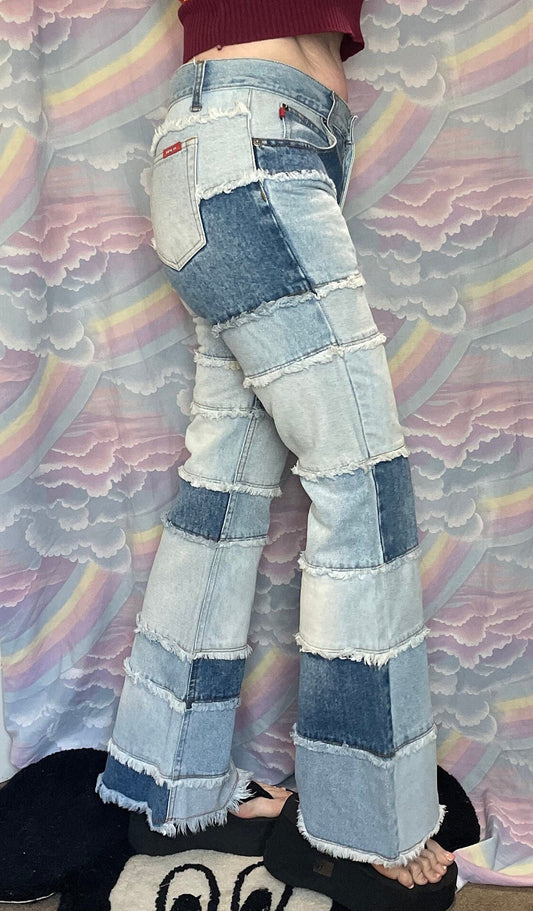vintage Y2K ZANA DI PATCHWORK Jeans // vintage mid rise bell bottoms light wash jeans 90s grunge bell bottom fringe geometric hippie boho