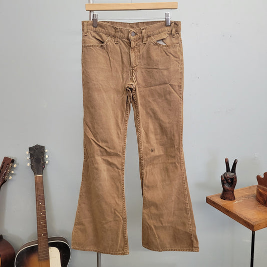 vtg 70s BROWN LEVIS JEANS / vintage distressed soft cotton flares khaki beige flare hippie rustic brown boot cut pants white tab earth tones