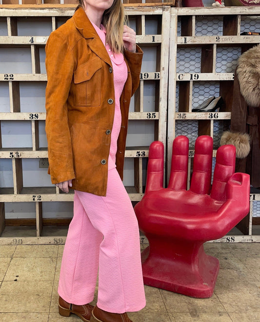 vtg 70s BUCKSKIN LEATHER JACKET // vintage akta getskinn soft suede western style ranch wear hippie unique structured autumn blazer tan coat
