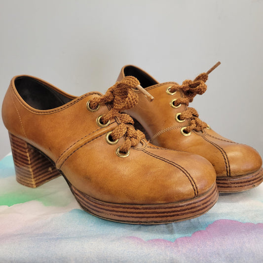 vtg 70s BROWN WOOD PLATFORMS // vintage beige leather stacked platform heels mod hippie disco boogie shoes autumn fall retro chunky heels