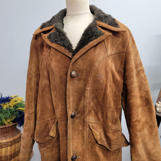 vtg 70s BROWN SUEDE JACKET // vintage the leather shop sears mens store size 40 sherpa fur lined retro western pointy collared cowboy ranch
