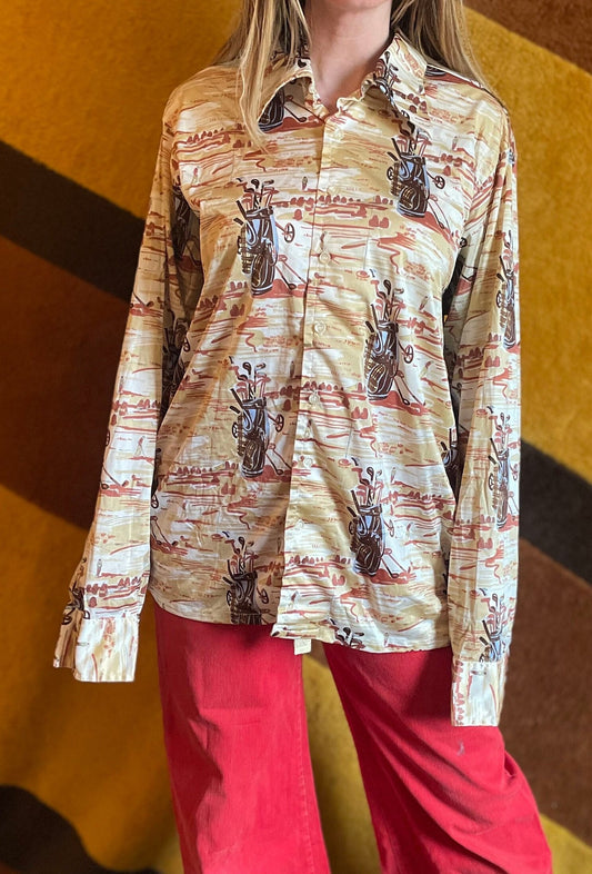 vtg 70s BURMA POLY TOP // psychedelic Golf print button down blouse Pointy Collar Retro aop print disco ball club dance slay retro costume
