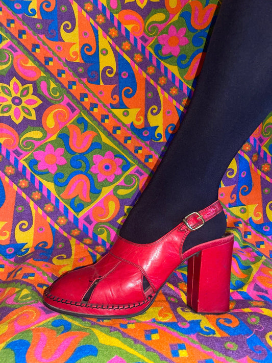 vtg 70s CHERRY RED PLATFORMS // vintage chunky pumps cut out peep toe sling back heels disco sexy dancing retro 70s stacked strappy heels