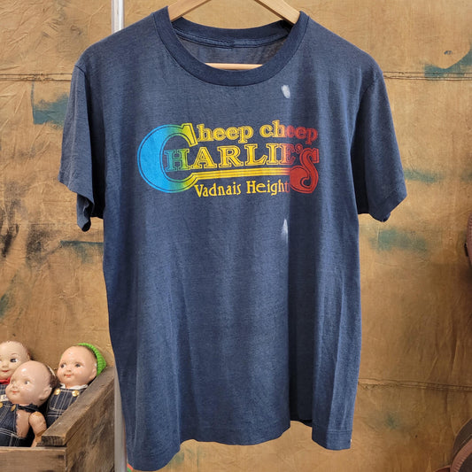 vtg 70s CHEAP CHARLIES TSHIRT // vintage vadnais heights minnesota minneapolis restaurant dine pizza pub food iconic neighborhood beer tee