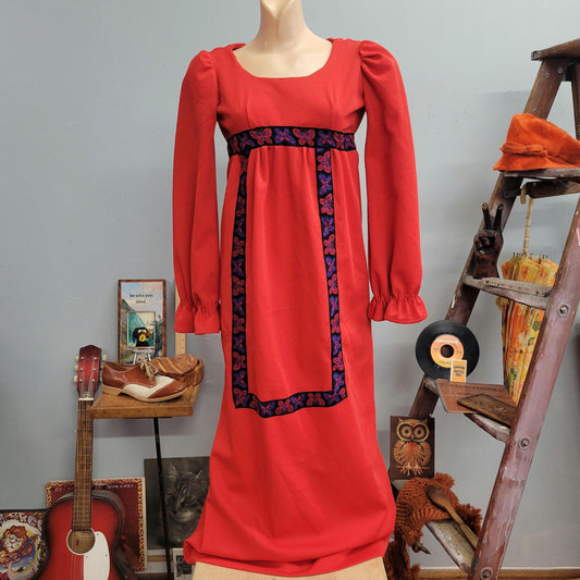 vtg 70s BUTTERFLY MAXI DRESS // vintage xtra small tapestry embroidered butterfly retro puffed sleeve psychedelic mod hippie petite womens
