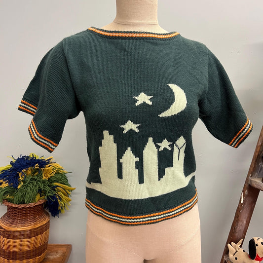 vtg 70s CITY CEMETERY TOP // vintage mister Noah large sweater vest graveyard striped cropped knit top retro celestial star pattern autumn