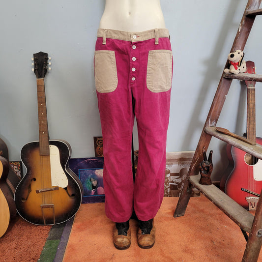 vtg 70s COLOR BLOCK PANTS // vintage 34 waist retro peter max wrangler style two tone red & beige flares wide leg bell bottoms autumn style
