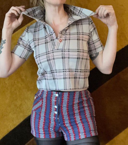 vtg 70s CUTE PINK & GRAY Top // vintage plaid crop top pointy collar mod retro preppy blouse decorative buttons cropped dress shirt twee