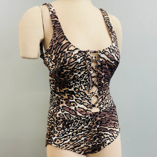 vtg 70s CUT OUT SWIMSUIT // vintage low cut back lace up leopard spot retro disco playsuit one piece bathing suit sexy animal print bodysuit