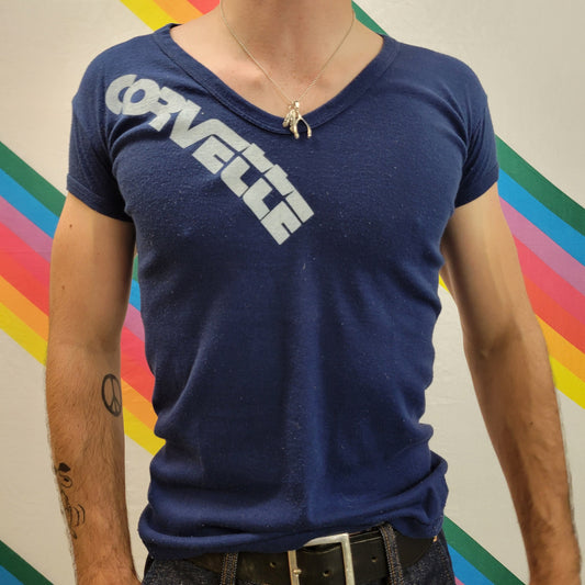 vtg 70s CORVETTE CAR TSHIRT // vintage stretchy v neck single stitch cute femme style french cut muscle car tight brand spell out logo sexy